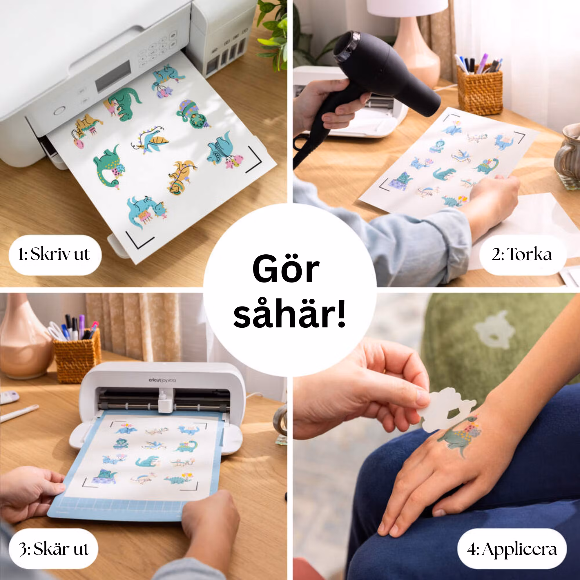 Efter utskriften är det viktigt att bläcket får torka helt innan du skär ut, för att snabba på torktiden kan du använda en hårtork.